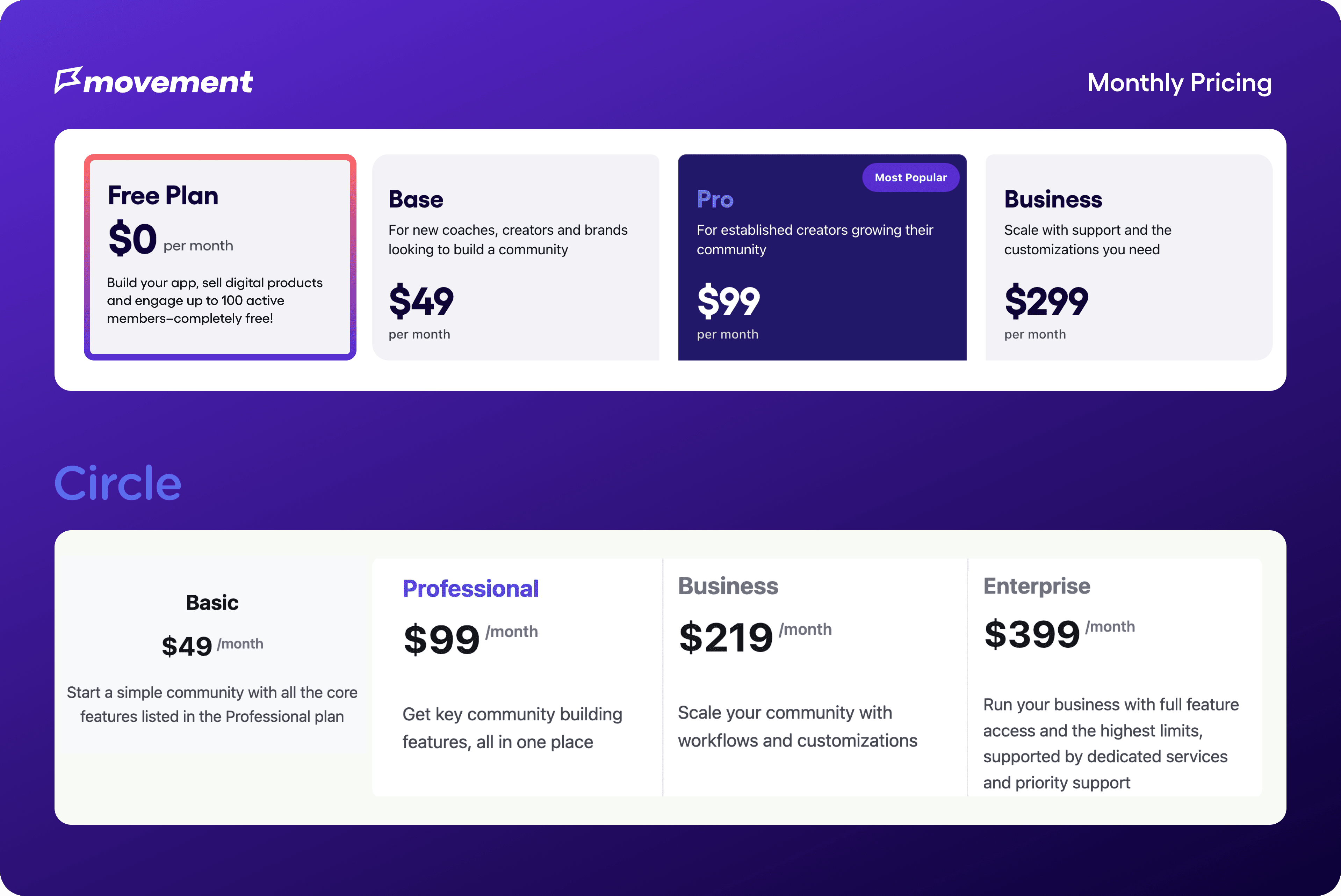 While both Movement.so and Circle.so offer pricing plans to suit various needs, Movement stands out with its flexibility and free option. The free plan on Movement allows you to experience the platform without any financial commitment upfront so you can test your idea first. And, all plans on Movement, both free and paid, include your own branded app for your community.